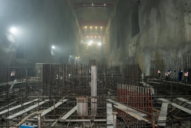沿着隧洞向山体里行进,就来到了巨大的地下厂房施工现场,厂房一侧工人们正进行1号机组蜗壳底板混凝土备仓和埋件安装,另一侧机电安装间里1号机组蜗壳也正加紧焊接。“预计5月能够实现蜗壳吊装,力争10月实现1号机组土建向机电交面。”三峡建工浙江天台抽水蓄能有限公司工程管理部工程师许智强说。