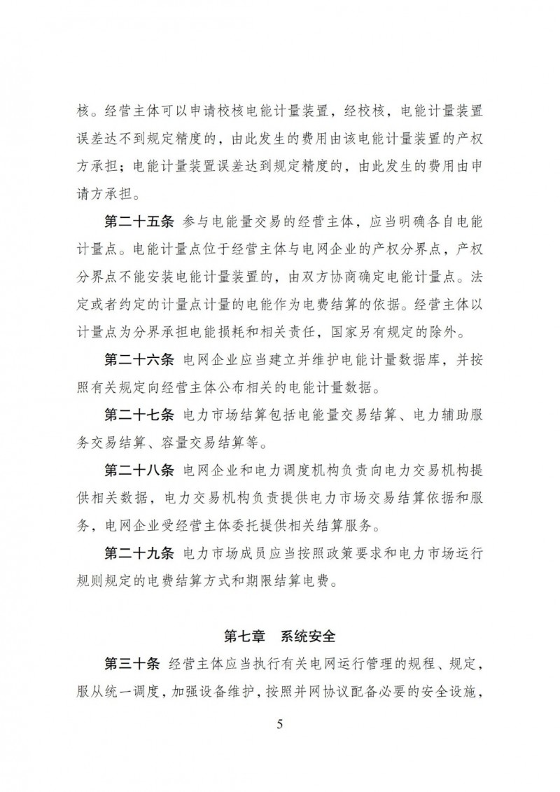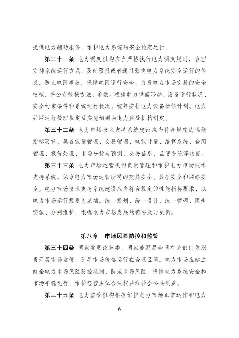 五是细化风险防控相关要求。电力监管机构根据市场运作和系统安全需要,制定电力市场暂停、中止、恢复等干预规则,规定电力市场干预措施实施条件和相关处理方法。电力市场运营机构按照“谁运营、谁防范,谁运营、谁监控”的原则,履行市场监控和风险防控责任,对市场依规开展监测。