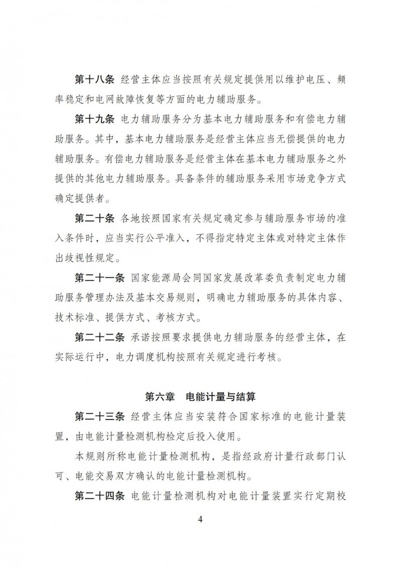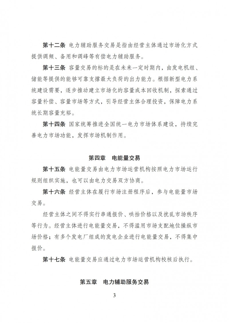 四是完善电能量、辅助服务交易等定义和交易方式。根据交易周期将电能量交易分为电力中长期交易和现货交易,电力辅助服务交易包括调频、备用和调峰等有偿电力辅助服务。电能量交易可通过双边交易和集中交易方式开展,具备条件的辅助服务采用市场竞争方式确定提供者。