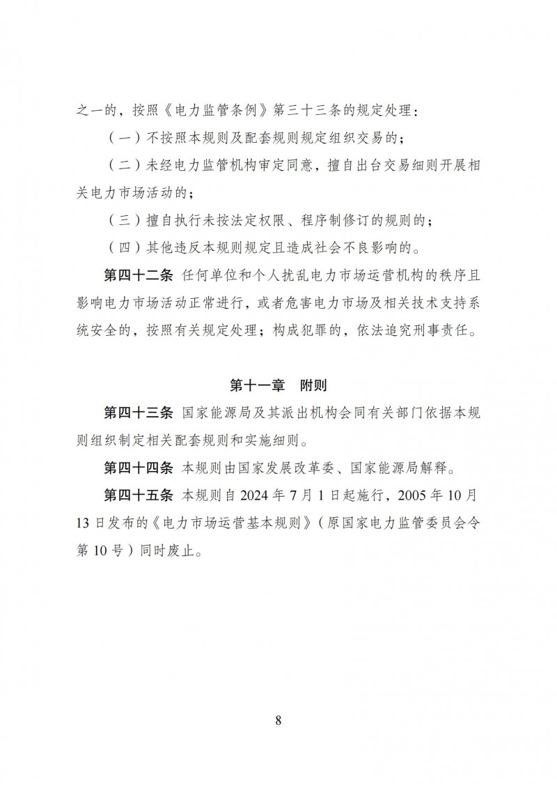 据储能界了解到,5月14日,国家发改委发布《中华人民共和国国家发展和改革委员会令》(第20号),宣布《电力市场运行基本规则》已经2024年4月18日第11次委务会议审议通过,现予公布,自2024年7月1日起施行。2005年10月13日发布的《电力市场运营基本规则》(原国家电力监管委员会令第 10 号)同时废止。