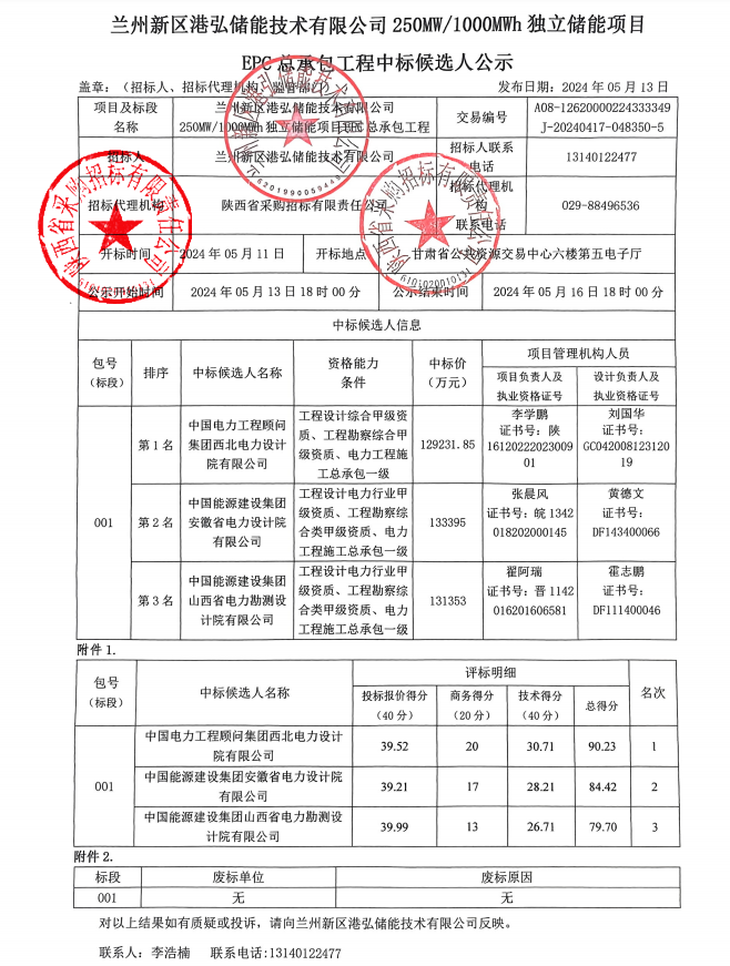 据储能界了解到,5月13日,兰州新区港弘储能技术有限公司250MW/1000MWh独立储能项目EPC总承包工程中标候选人公示。