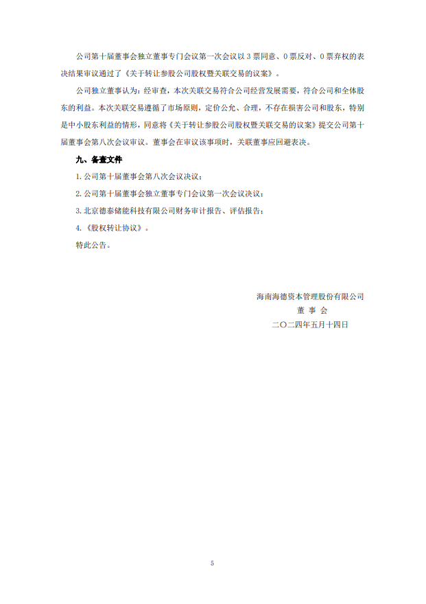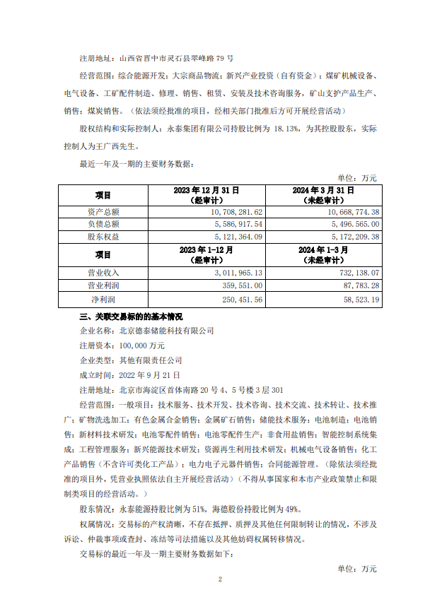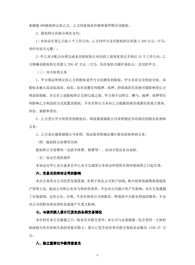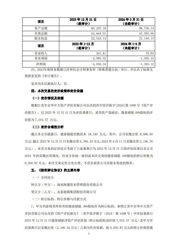 根据公告,德泰储能由公司与永泰能源于2022年9月21日共同出资设立,永泰能源持有德泰储能51%股权,为其控股股东,公司持有德泰储能49%股权。本次交易参考资产评估机构出具的资产评估结果,经双方协商确定德泰储能49%股权转让价格为9200.87万元。