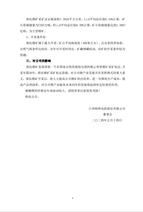 据储能界了解到,5月13日,江特电机发布公告称获得采矿许可证,所开采矿山为茜坑锂矿,江特电机表示,茜坑锂矿采矿权证获批,对公司锂产业发展具有里程碑式的重大意义,茜坑锂矿开采后,将大大提高公司锂矿的自给率,进一步降低生产成本,提高产品利润率,对公司锂产业板块未来30年的发展起到举足轻重的作用。