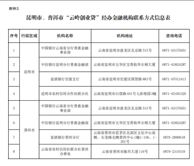 3.昆明市、普洱市“云岭创业贷”经办金融机构联系方式信息表