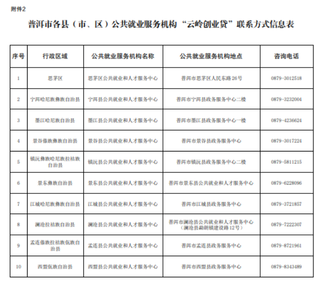2.普洱市各县(市、区)公共就业服务机构“云岭创业贷”联系方式信息表