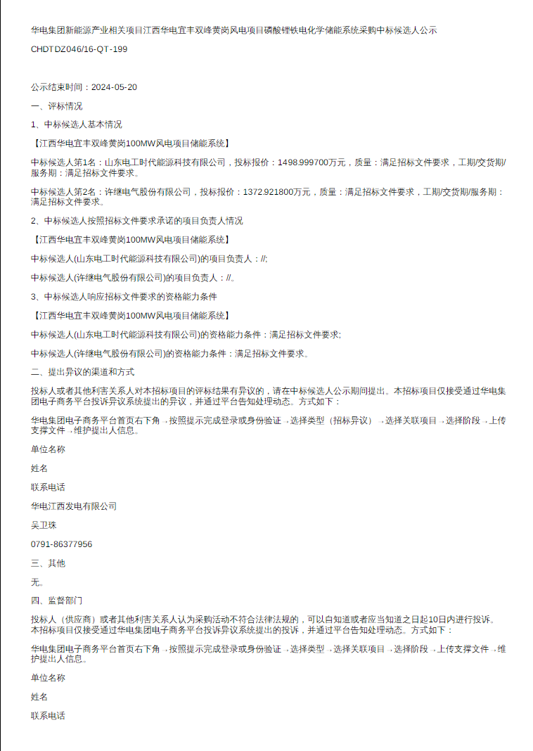 据储能界了解到,5月16日,江西华电宜丰双峰黄岗风电项目磷酸锂铁电化学储能系统采购中标候选人公示发布。