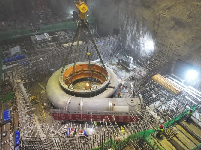 “浙江天台抽蓄1号机组座环是带着蜗壳延伸段一起吊装的,这是国内抽水蓄能领域首次开发并成功使用的创新型工法。”据三峡建工浙江天台抽蓄公司工程管理部副主任强林林介绍,1号机组座环、蜗壳与蜗壳延伸段在安装间焊接成整体后一次性吊装,与传统工法相比,至少节约十天工期。