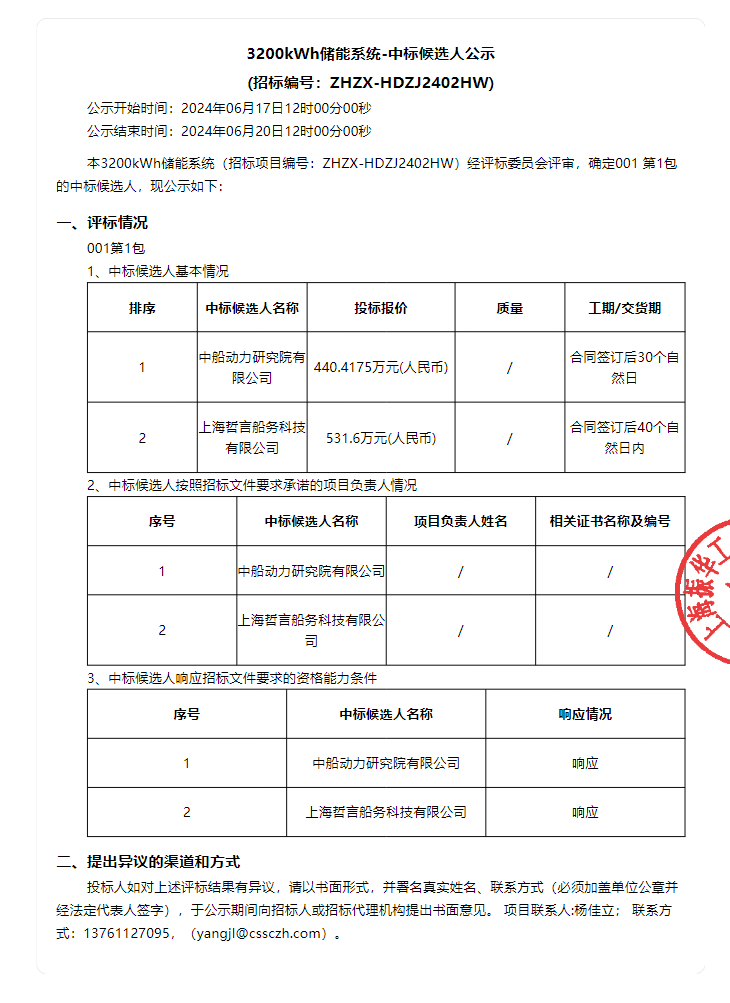 第一中标候选人为中船动力研究院有限公司,投标报价440.4175万元,折合单价1.376元/Wh;第二中标候选人为上海哲言船务科技有限公司,投标报价531.6万元,折合单价1.661元/Wh。