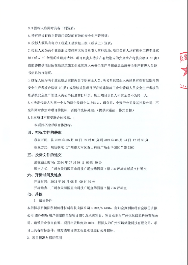 据储能界了解到,6月18日,衡阳凯新特种材料科技有限公司3.3MW/6.6MWh、衡阳金则利特种合金股份有限公司3MW/6MWh用户侧储能电站项目EPC总承包项目招标公告发布,项目招标人为广州恒运储能科技有限公司,项目位于湖南省衡阳市雁峰区。