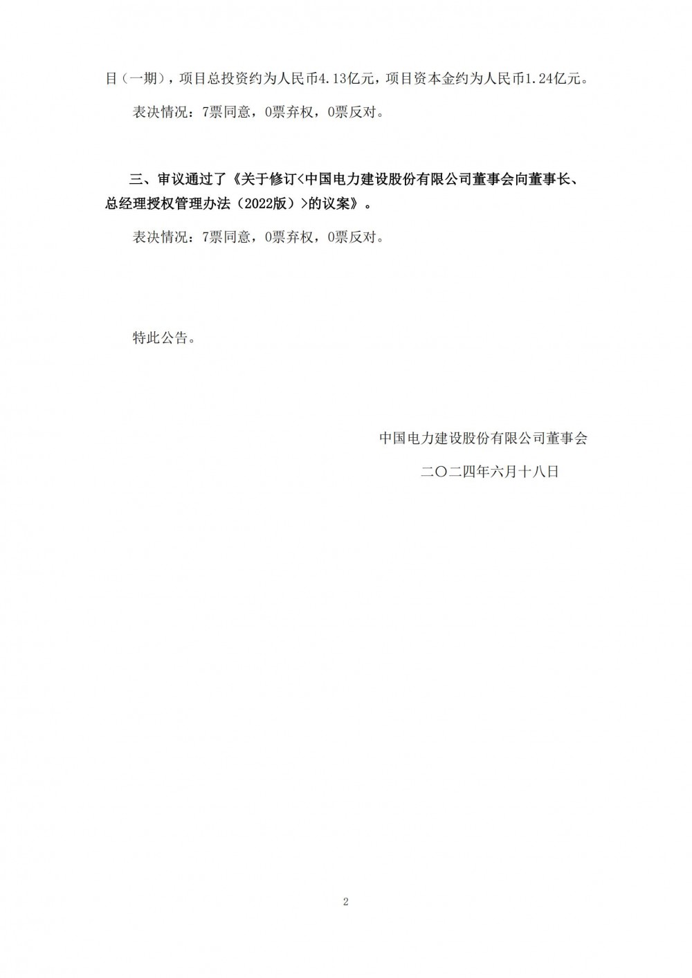 中国电建董事会同意由公司下属子公司中国电建集团成都勘测设计研究院有限公司通过所属九寨沟水电开发有限责任公司投资建设白水江流域水光一体化项2目(一期),项目总投资约为人民币4.13亿元,项目资本金约为人民币1.24亿元。