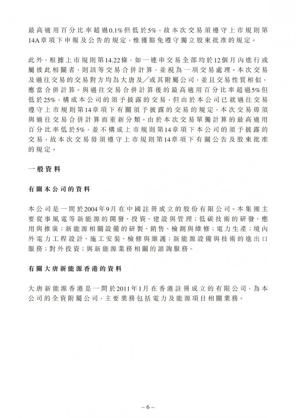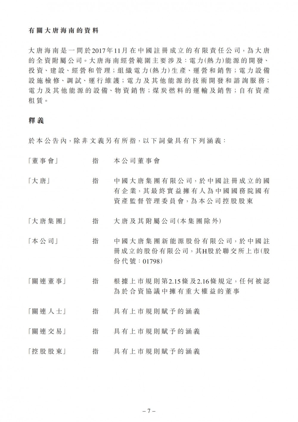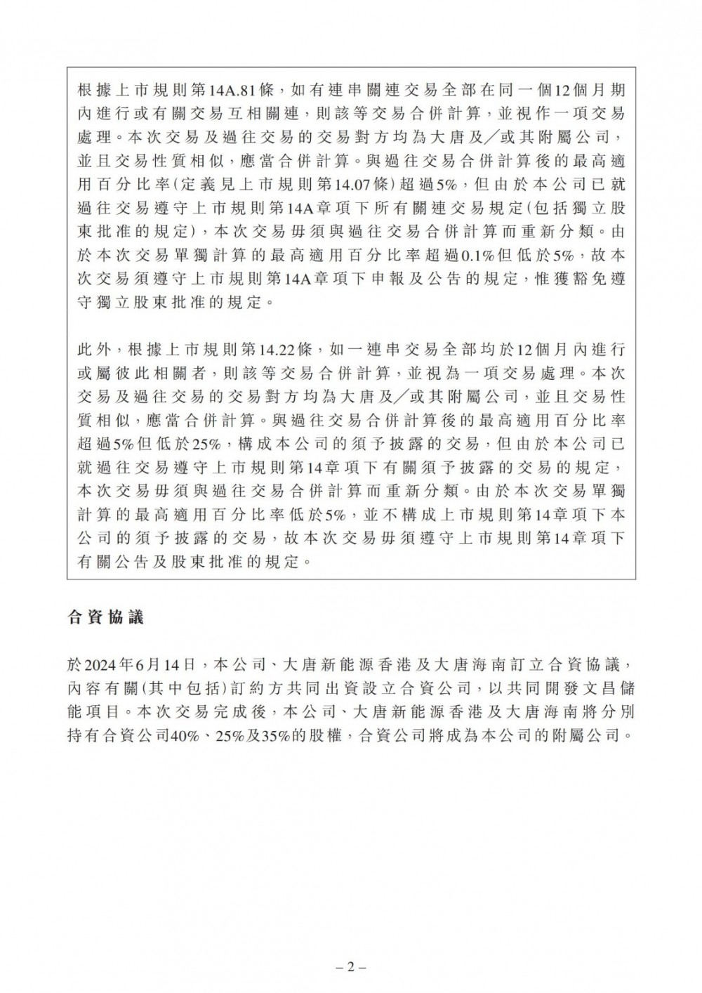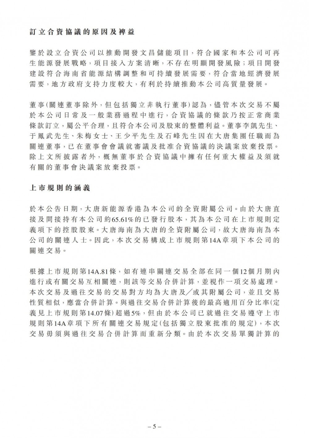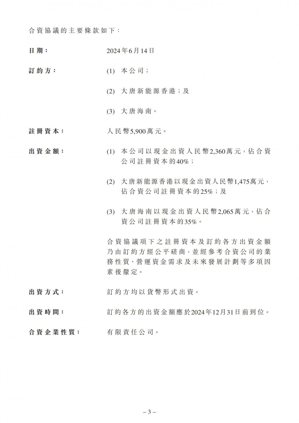 根据合资协议,合资公司注册资本为人民币5,900万元,其中大唐新能源以现金出资人民币2,360万元,占合资公司注册资本的40%;大唐新能源香港以现金出资人民币1,475万元,占合资公司注册资本的25%;大唐海南以现金出资人民币2,065万元,占合资公司注册资本的35%。