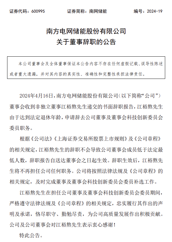 据储能圈了解到,4月16日,南网储能发布关于董事辞职的公告。