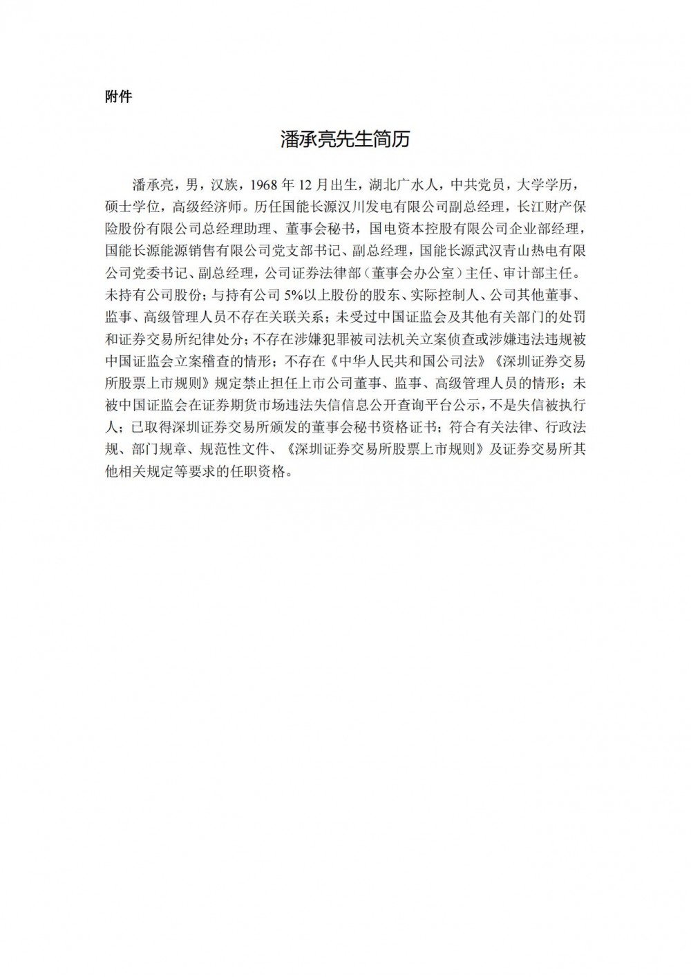 潘承亮,男,汉族,1968年12月出生,湖北广水人,中共党员,大学学历,硕士学位,高级经济师。历任国能长源汉川发电有限公司副总经理,长江财产保险股份有限公司总经理助理、董事会秘书,国电资本控股有限公司企业部经理,国能长源能源销售有限公司党支部书记、副总经理,国能长源武汉青山热电有限公司党委书记、副总经理,公司证券法律部(董事会办公室)主任、审计部主任。