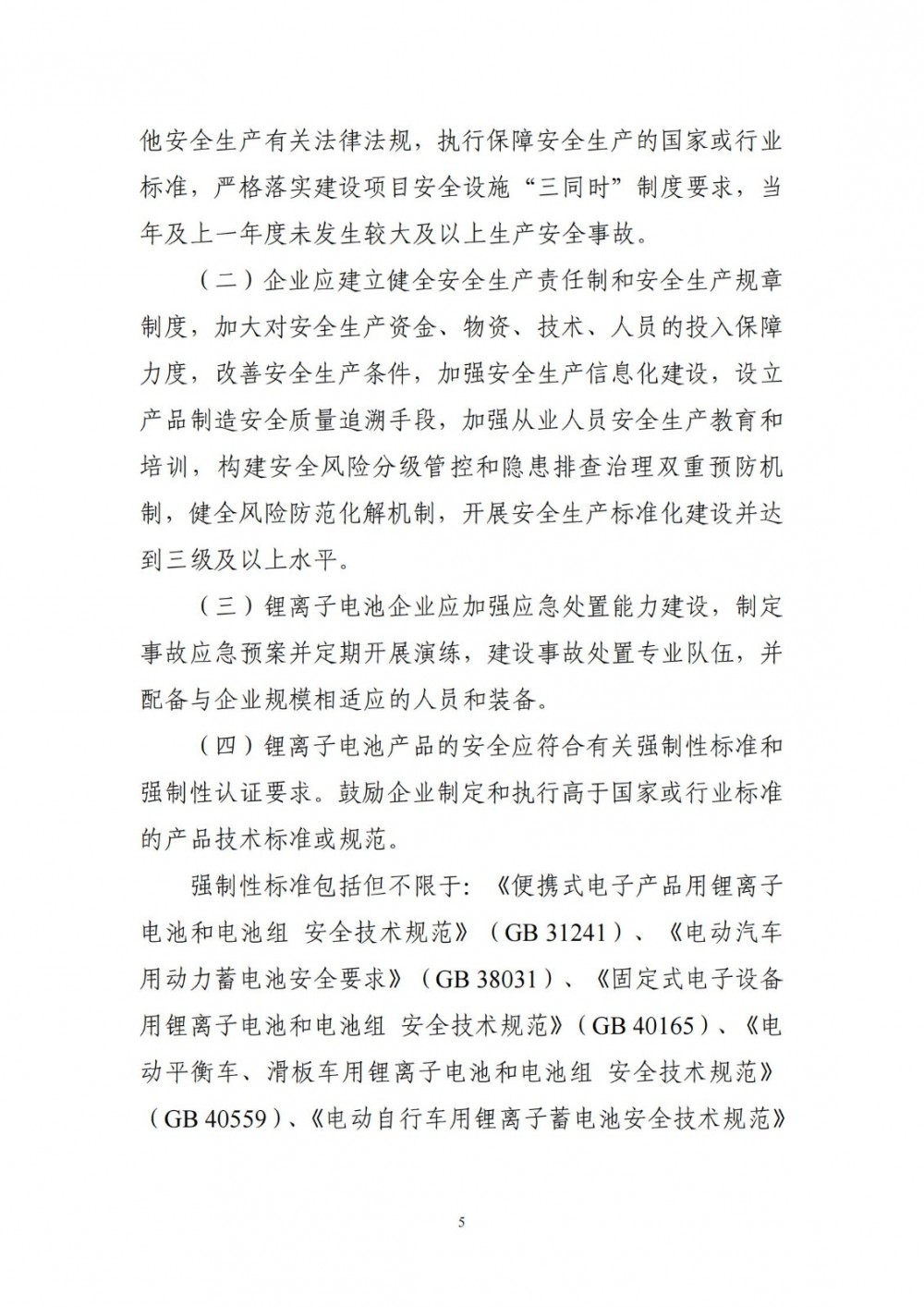 文件提出,锂电池产品的安全应符合有关强制性标准要求,并经具有相应资质的检测机构检验合格。强制性标准包括但不限于《电能存储系统用锂蓄电池和电池组安全要求》等。