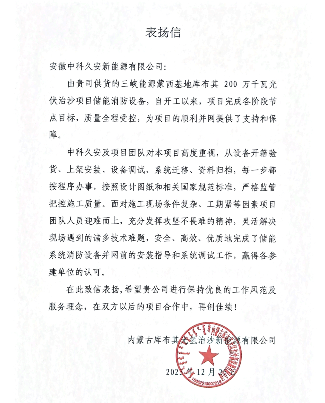 中科久安在库布其沙漠光伏项目中展现出的卓越能力和出色表现更是赢得了业主单位的赞誉。面对沙漠昼夜温差大、风沙肆虐的极端的自然环境,中科久安项目团队人员迎难而上,充分发挥攻坚不畏难的精神,凭借丰富的项目经验和深厚的技术积累,成功解决现场遇到的诸多技术难题,安全、高效、优质地完成了储能系统消防设备并网前的安装指导和系统调试工作,为项目的顺利实施提供了有力保障。