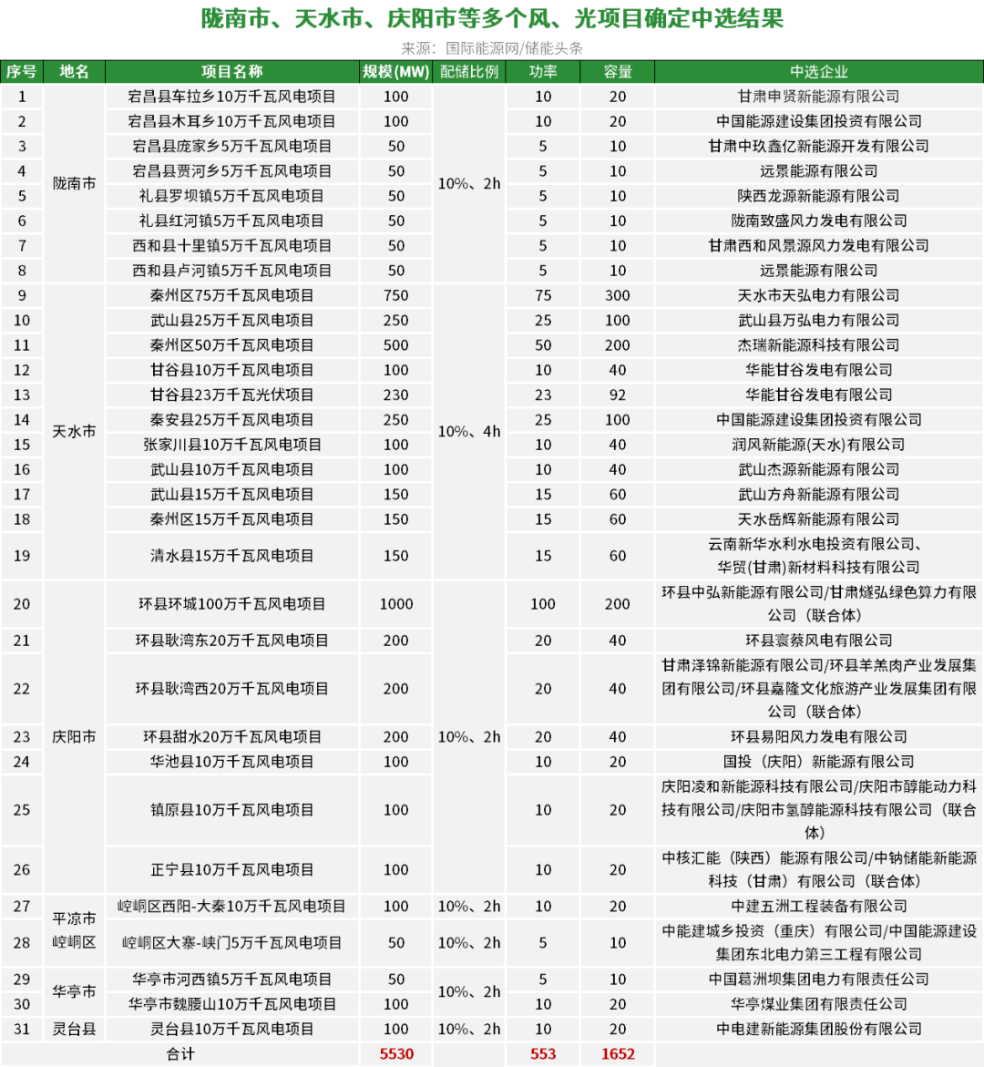 陇南、天水、庆阳、平凉、华亭、灵台县等31个项目已公布竞配结果,新能源总规模5.53GW,对应配储总规模553MW/1652MWh。
