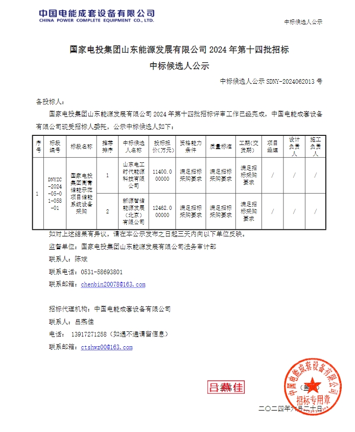中标候选人第一名为山东电工时代能源科技有限公司,投标报价11400万元,折合单价0.57元/Wh;中标候选人第二名为新源智储能源发展(北京)有限公司,投标报价12462万元,折合单价0.6231元/Wh。