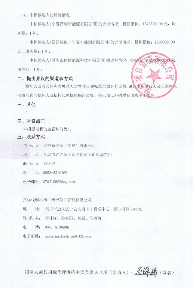 中标候选人第1名为宁夏泽瑞新能源有限公司,投标报价157.65万元;中标候选人第2名为国润绿色(宁夏)能源有限公司,投标报价180万元;中标候选人第3名为吴忠市候桥能源科技有限公司,投标报价200万元。