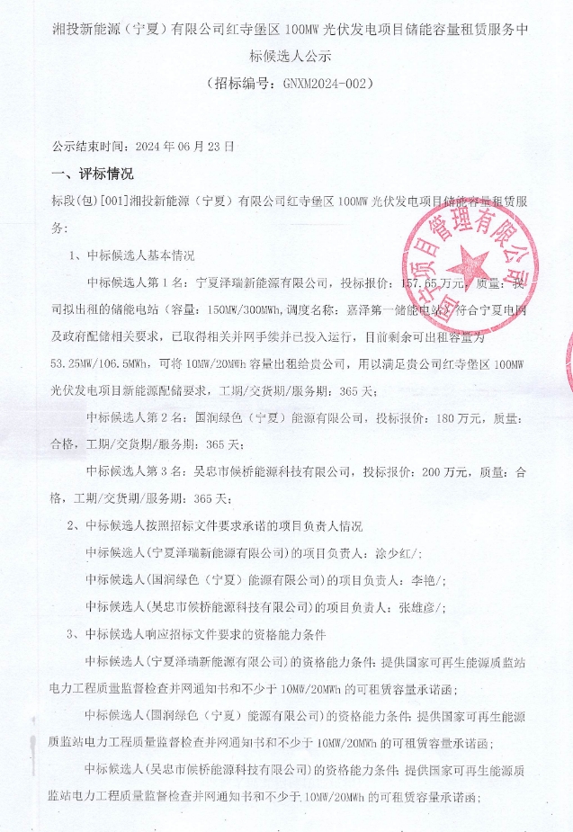 据储能界了解到,6月20日,湘投新能源(宁夏)有限公司红寺堡区100MW光伏发电项目储能容量租赁服务中标候选人公示发布,储能租赁容量10MW/20MWh,服务期1年。