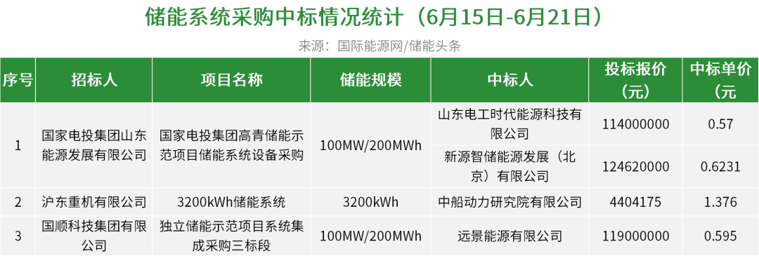 国家电投有1个项目分布中标结果,总规模为100MW/200MWh,电工时代、新源智储入围;