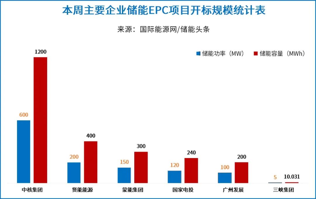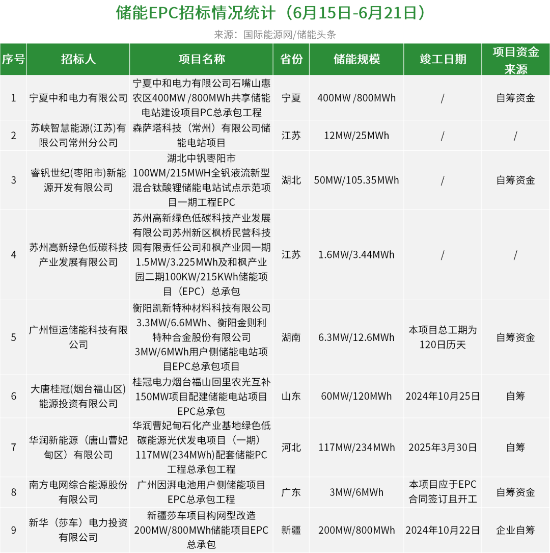 据统计,本周华润电力、南方电网、中核集团、大唐集团、恒运集团等发布了9个储能EPC招标项目,招标规模为849.9MW/2106.39MWh。项目位于宁夏、江苏、湖北、湖南、山东、河北、广东、新疆等地。