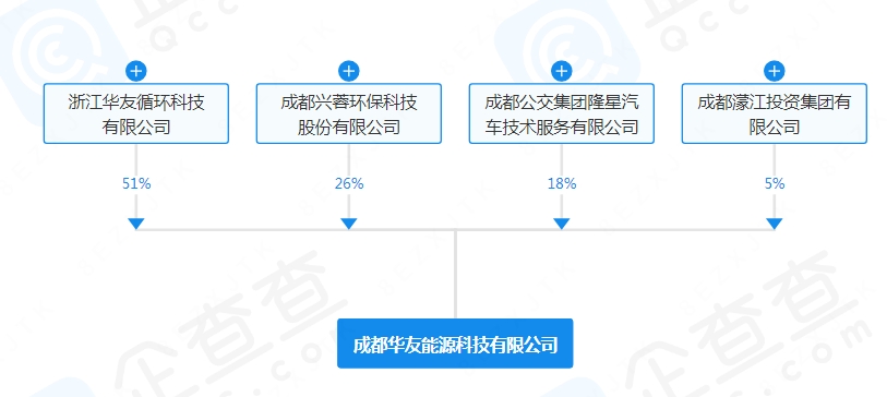 根据股权穿透显示,该公司由华友钴业全资子公司浙江华友循环科技有限公司、成都兴蓉环保科技股份有限公司、成都公交集团隆星汽车技术服务有限公司、成都濛江投资集团有限公司共同持股。