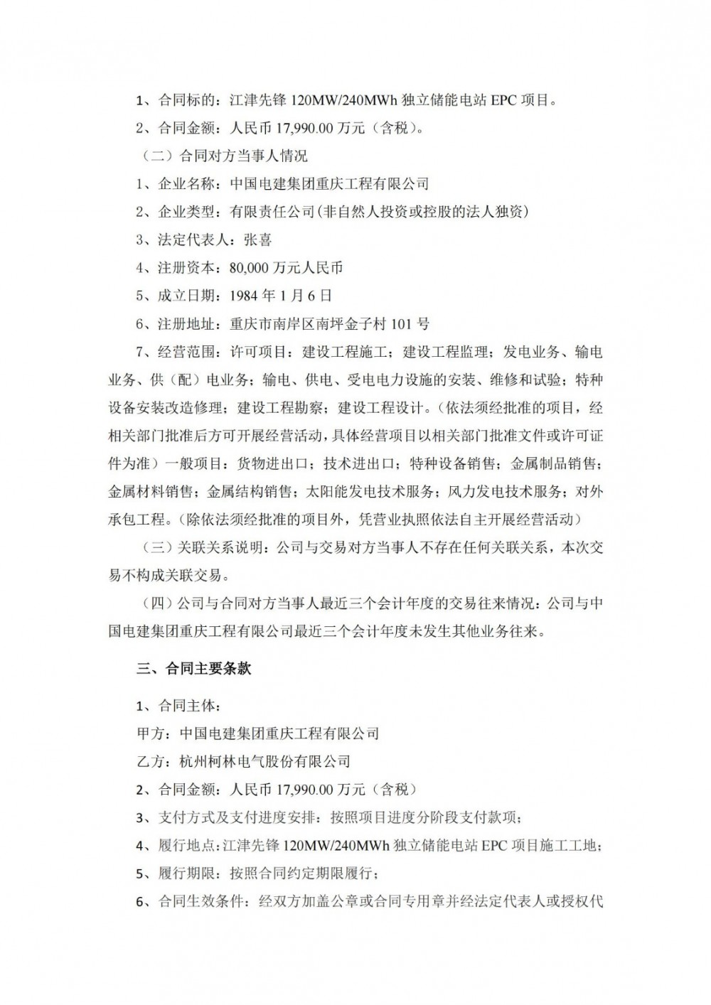 据储能界了解到,6月24日,杭州柯林发布公告称,公司于近日与中国电建集团重庆工程有限公司签订了江津先锋120MW/240MWh独立储能电站EPC项目储能设备及其附件采购合同,合同总金额为人民币17,990.00万元(含税)。