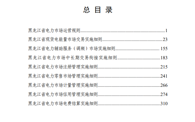 文件包括了《黑龙江省电力市场运营规则》、《黑龙江省现货电能量市场交易实施细则》、《黑龙江省电力辅助服务(调频)市场实施细则》、《黑龙江省电力市场中长期交易衔接实施细则》、《黑龙江省电力市场注册管理实施细则》、《黑龙江省电力零售市场管理实施细则》、《黑龙江省电力市场计量管理实施细则》、《黑龙江省电力市场信用管理实施细则》、《黑龙江省电力市场电费结算实施细则》九个细则。