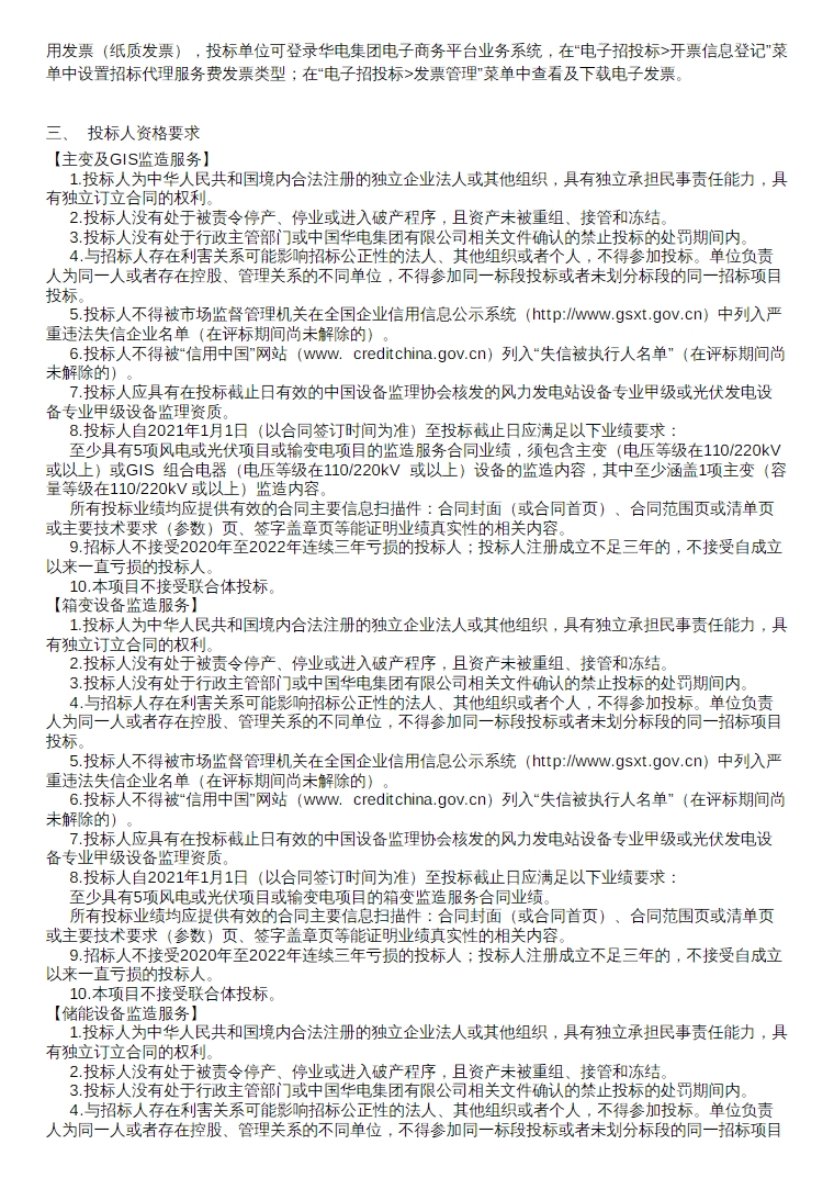 共招标三个标段,其中标段一为主变及GIS监造服务,主变容量约24GVA,GIS数量约300个间隔;标段二为35kV箱变设备监造服务,容量约22.1185GVA;标段三为储能设备监造服务,容量约11.57GWh。