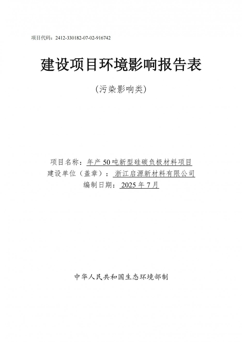 近日,杭州市生态环境局披露了《浙江启源新材料有限公司年产50吨新型硅碳负极材料项目受理公示》。