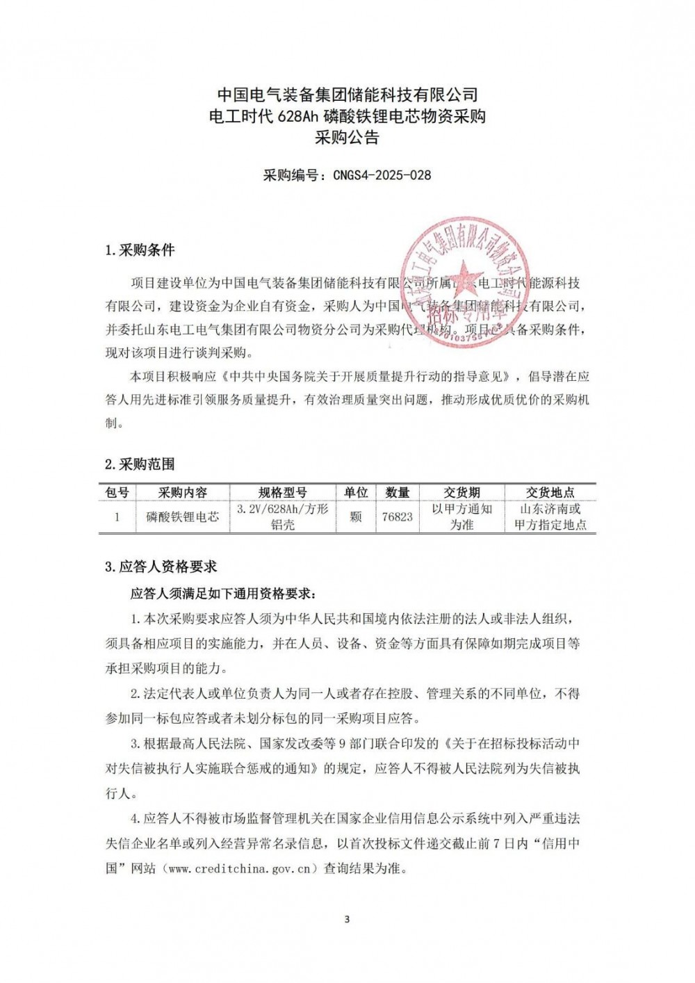 本次采购3.2V/628Ah磷酸铁锂电芯共76823颗,总规模为154.383MWh,交货地点为山东济南或甲方指定地点。