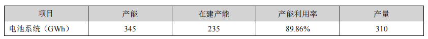 宁德时代电池系统产能345GWh,在建产能235GWh,产能利用率89.86%,产量310GWh。