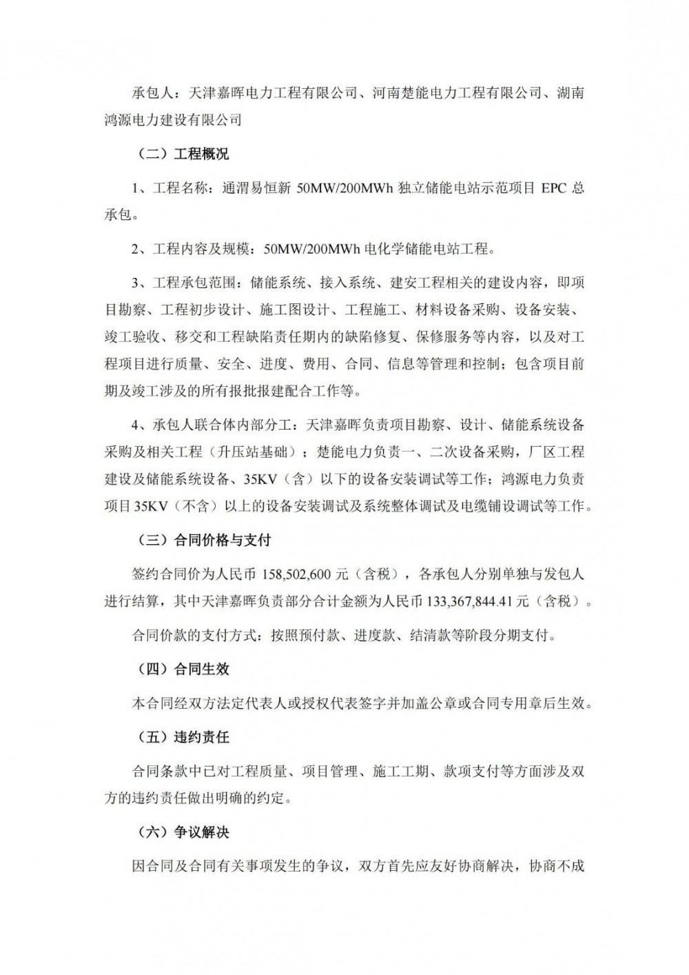 签约合同价为人民币158,502,600元(含税),各承包人分别单独与发包人进行结算,其中天津嘉晖负责部分合计金额为人民币133,367,844.41元(含税)。