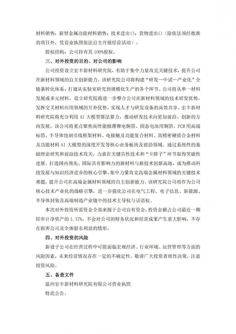 宏丰新材料研究院将充分利用AI大模型算法算力,推动研发技术向更加前沿、创新的方向发展,该公司将重点聚焦高性能极薄锂电铜箔、固态电池用铜箔、PCB用高端标箔、半导体蚀刻引线框架材料、电接触及功能复合材料、高精密硬质合金材料及功能材料AI大模型的深度开发等核心业务板块及前沿领域。通过系统性的基础理论研究和前沿技术攻关,力求在关键共性技术和“卡脖子”环节取得突破性进展。打造国内领先、国际具有影响力的新材料与新技术创新高地,成为推动科技发展与知识经济进步的核心引擎,集中力量攻克高端金属材料领域的关键技术难题,提升公司在高端金属材料领域的自主创新能力。该研究院公司将作为公司核心技术产业化的战略引擎,进一步强化公司在电气工程、电子信息、新能源、半导体封装及高端制造产业链中的技术主导权与话语权。