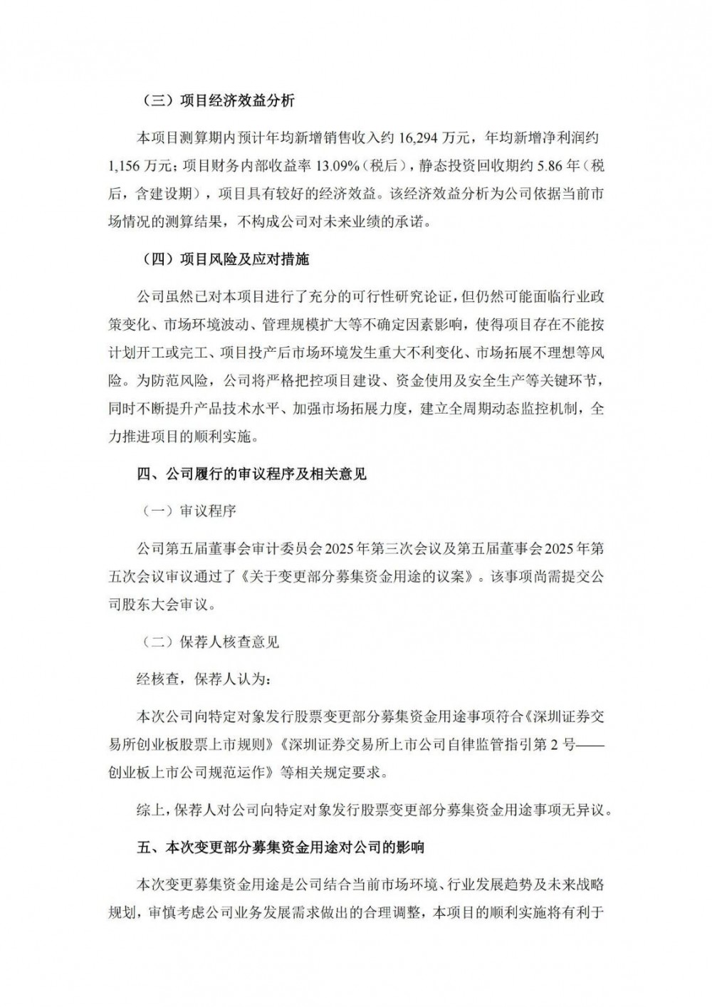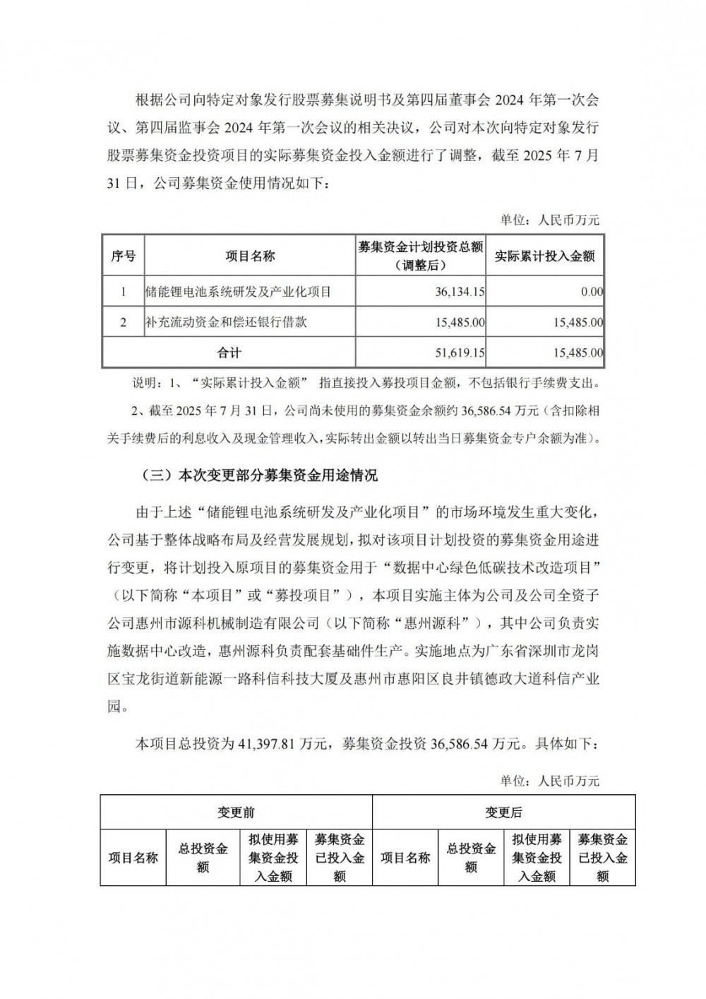 公告显示,“储能锂电池系统研发及产业化项目”原计划由公司购置生产设备、研发设备,进一步扩大储能锂电池系统产能规模,继续积极开展储能行业内新材料、新技术、新产品方面的相关研究,为公司深度布局储能业务,参与电化学储能行业竞争提供发展动能。项目全部建成达产后,将新增2GWh储能锂电池电芯和系统组装生产线及相关配套产能规模。项目投资总额为54,000.34万元,建设期24个月,公司拟使用募集资金额44,017.71万元,调整后募集资金投资总额36,134.15万元。实施主体为公司控股子公司广东科信聚力新能源有限公司,达到预定可使用状态时间为2026年1月8日。