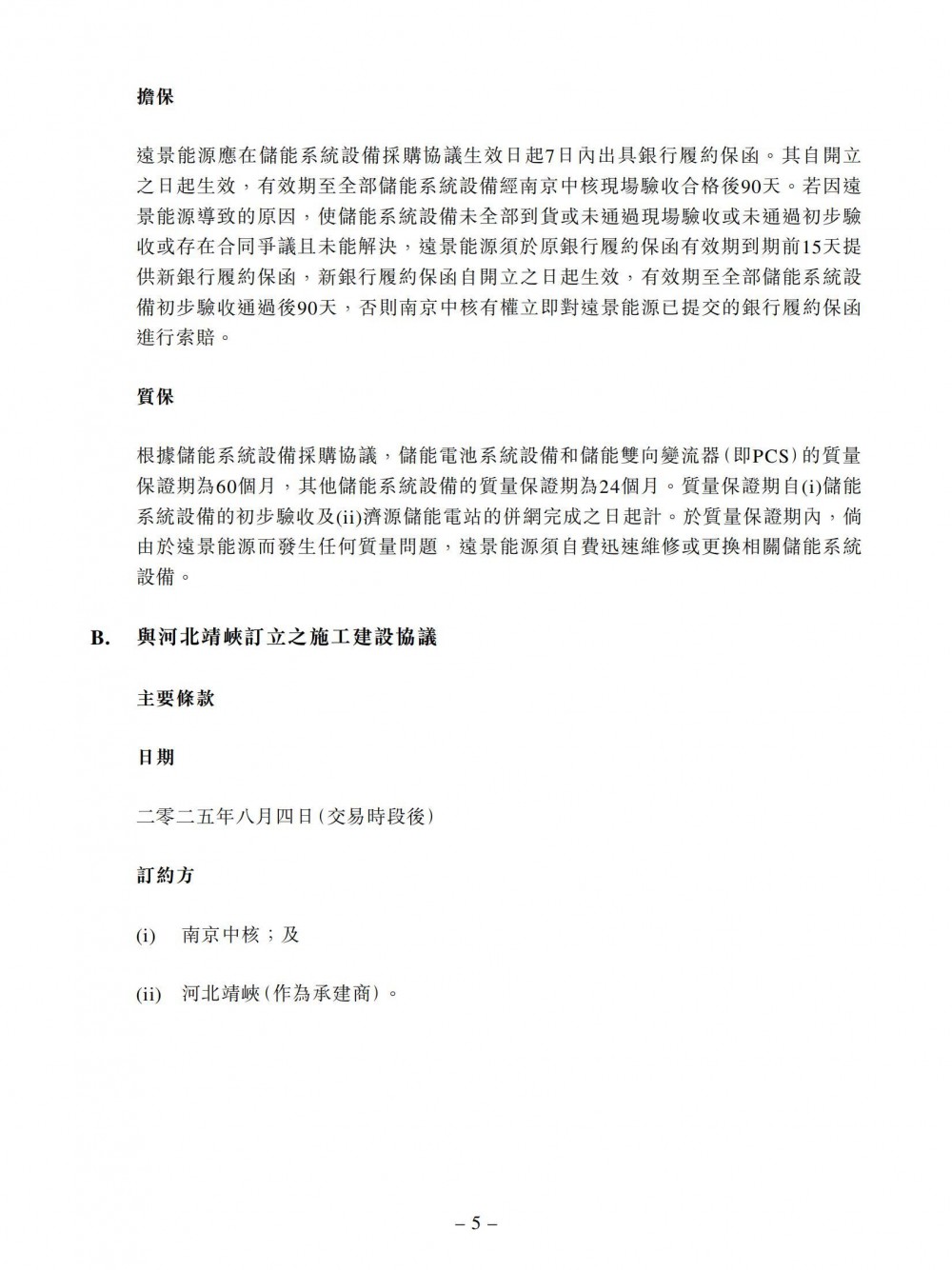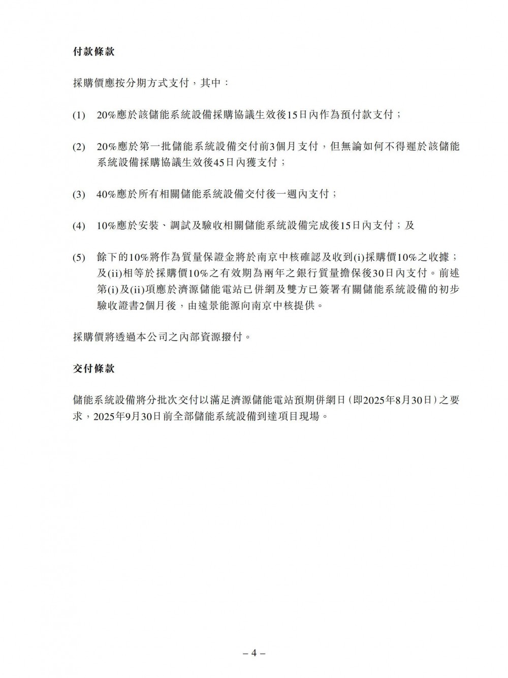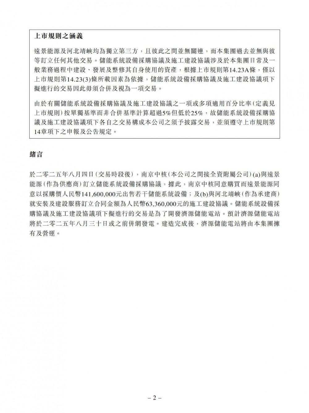 储能系统设备采购协议及施工建设协议项下拟进行的交易是为了开发济源储能电站。预计济源储能电站将于2025年8月30日或之前并网发电。建造完成后,济源储能电站将由集团拥有及营运。