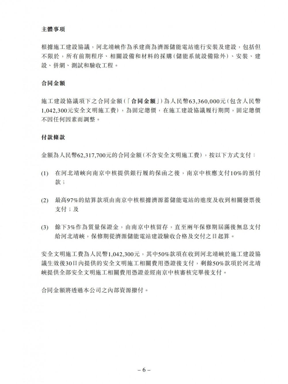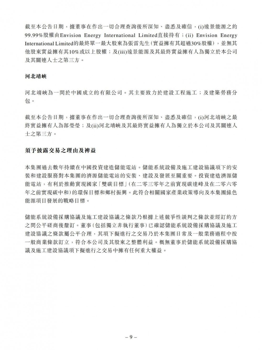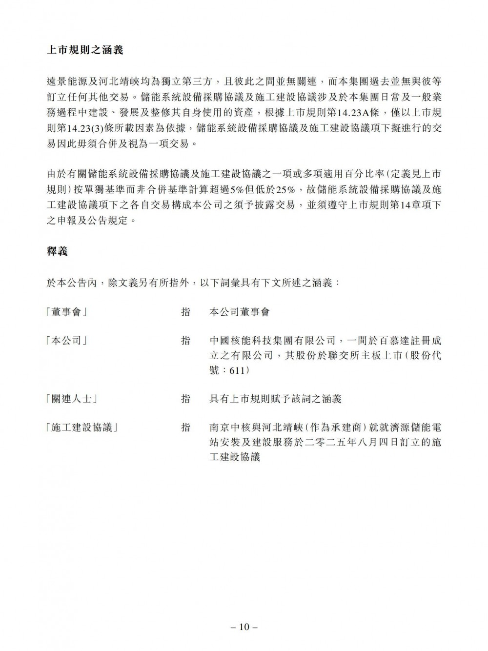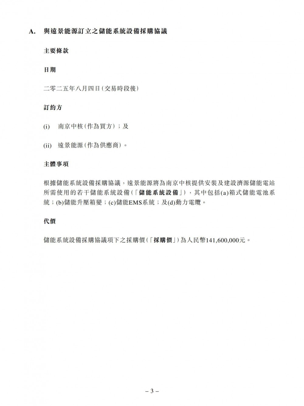 储能系统设备采购协议及施工建设协议项下拟进行的交易是为了开发济源储能电站。预计济源储能电站将于2025年8月30日或之前并网发电。建造完成后,济源储能电站将由集团拥有及营运。