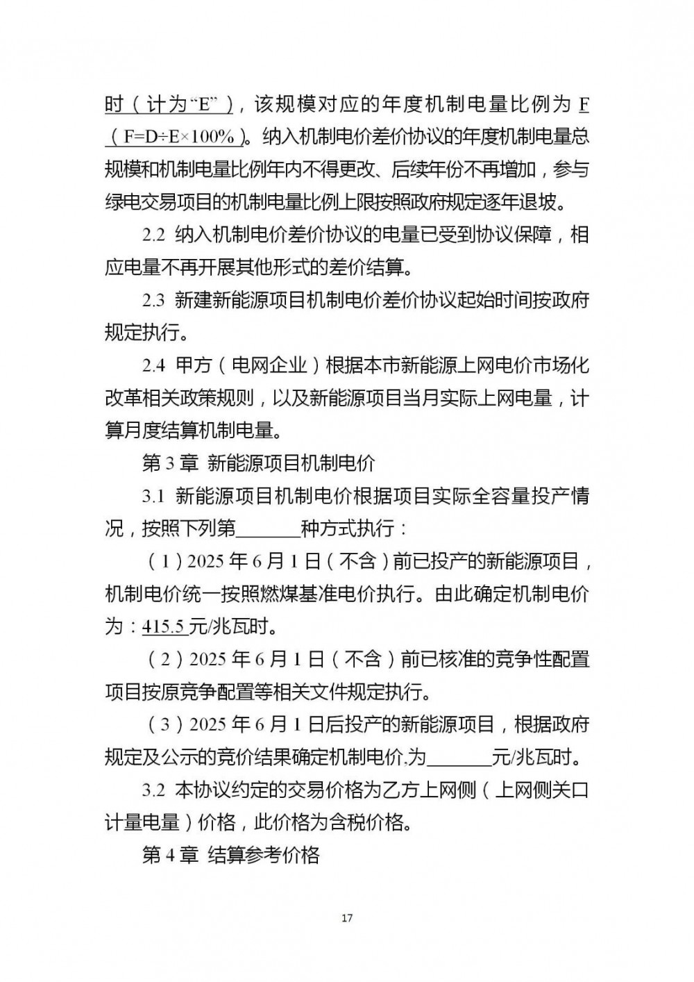 2025年6月1日(不含)前全容量并网的存量项目:最高按年度电量总规模的100%纳入机制电量,年度电量总规模原则上按照该项目近3年上网电量均值确定;机制电价统一为0.4155元/千瓦时。
