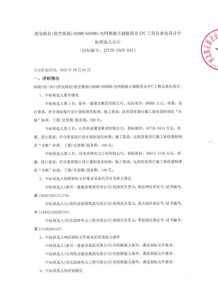 8月4日,西安阎良(航空基地)300MW/600MWh电网侧独立储能项目EPC工程总承包项目中标候选人公示。