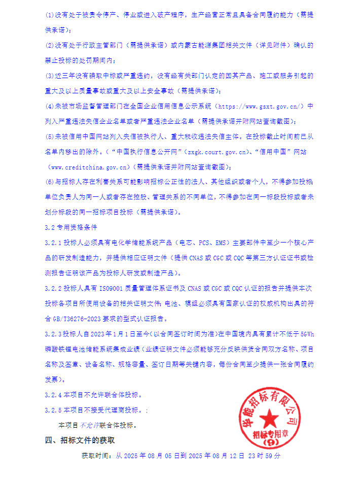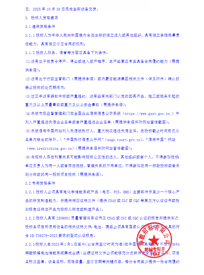 据了解,投标人必须具有电化学储能系统产品(电芯、PCS、EMS)主要部件中至少一个核心产品的研发制造能力,并提供相应证明文件,且投标人自2023年1月1日至今(以合同签订时间为准)在中国境内具有累计不低于5GWh磷酸铁锂电池储能系统集成业绩。