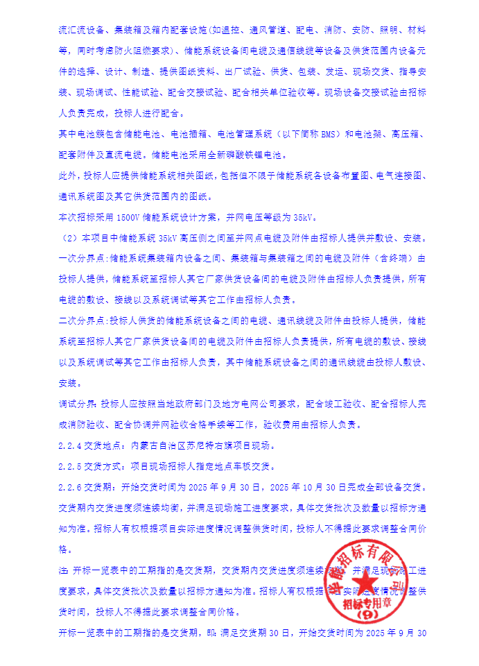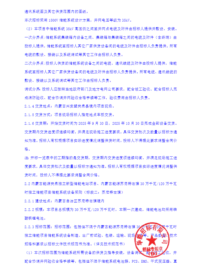 招标范围包括但不限于内蒙古能源苏尼特右旗30千瓦时独立储能项目储能系统设备制造、出厂前试验、包装、运输、现场技术规格和要求以招标文件技术规范书为准。