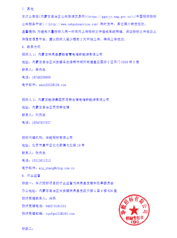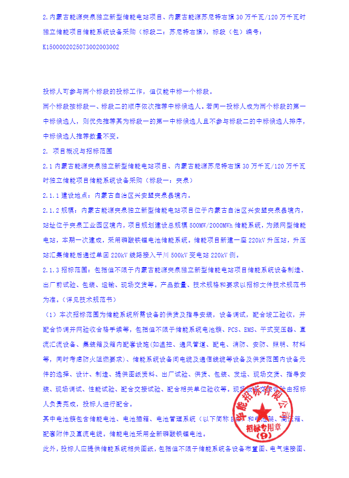 储能界获悉,8月5日,内蒙古能源突泉独立新型储能电站项目、内蒙古能源苏尼特右旗30万千瓦/120万千瓦时独立储能项目储能系统设备采购(标段一:突泉;标段二:苏尼特右旗)招标公告发布。