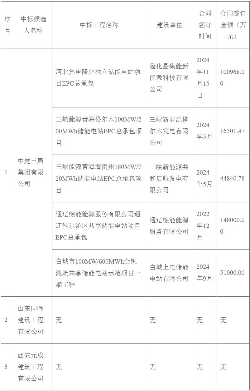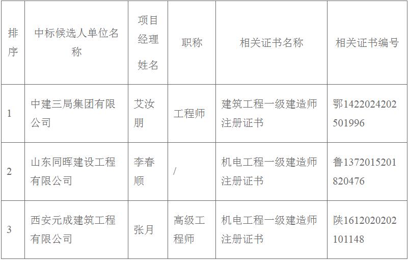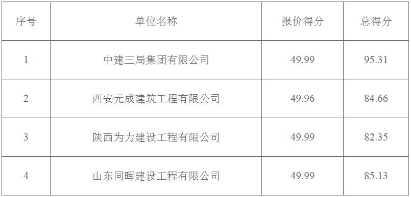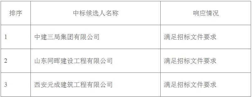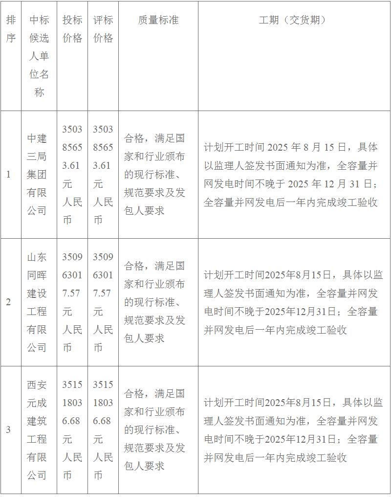 第一中标候选人为中建三局集团有限公司,投标报价为350385653.61元,折合单价0.876元/Wh;第二中标候选人为中建三局集团有限公司,投标报价为350963017.57元,折合单价0.877元/Wh;第三中标候选人为西安元成建筑工程有限公司,投标报价为351518036.68元,折合单价0.879元/Wh。