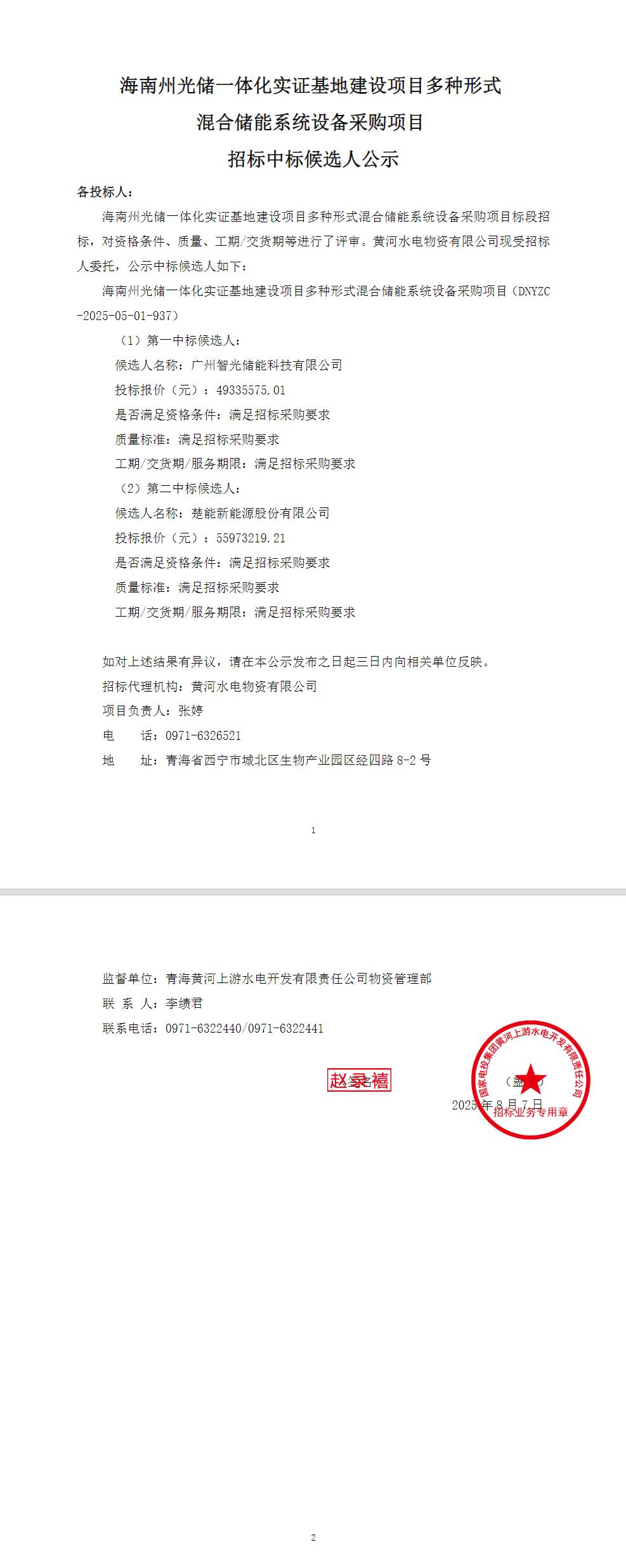 8月7日,海南州光储一体化实证基地建设项目多种形式混合储能系统设备采购项目招标中标候选人公示。