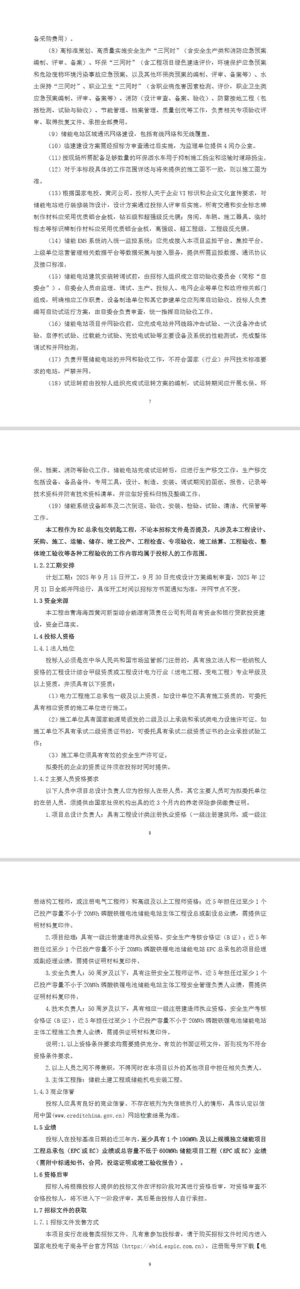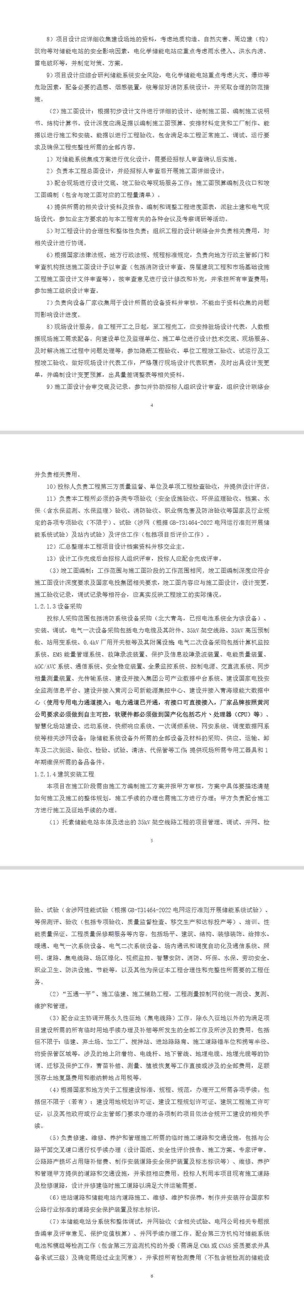 德令哈托素储能电站工程EC总承包项目,建设容量为150MW/600MWh(直流侧电池容量)的磷酸铁锂电池储能系统,储能电站具备作为独立市场主体参与电网调度及电力市场交易功能。具体招标范围包括:勘察设计、设备和材料采购(不含储能系统设备采购)、设备监造(不含储能系统设备)、建筑安装工程施工、项目管理、电力质监、质量监督、技术监督、调试、试验、验收(含专项验收(包括安全设施验收、环保监理验收、档案、水保(含水保监测、水保监理)验收、消防验收、职业病危害及防治验收等国家及行业规定的各项专项验收(不限于)、移交生产及达标投产等)、培训、性能质量保证、工程质量保修期服务等内容;负责下述工作内容,承担所有相关费用。