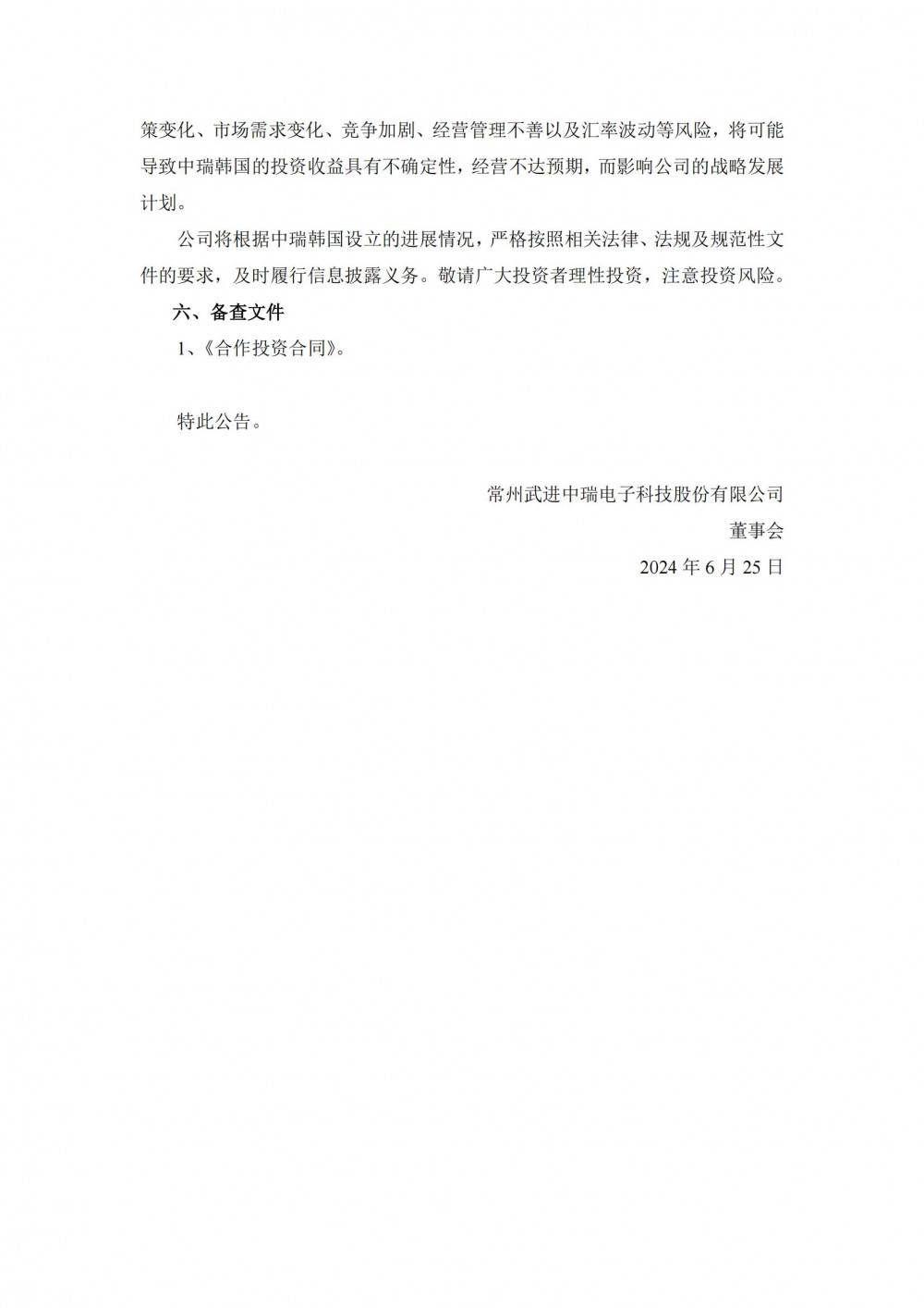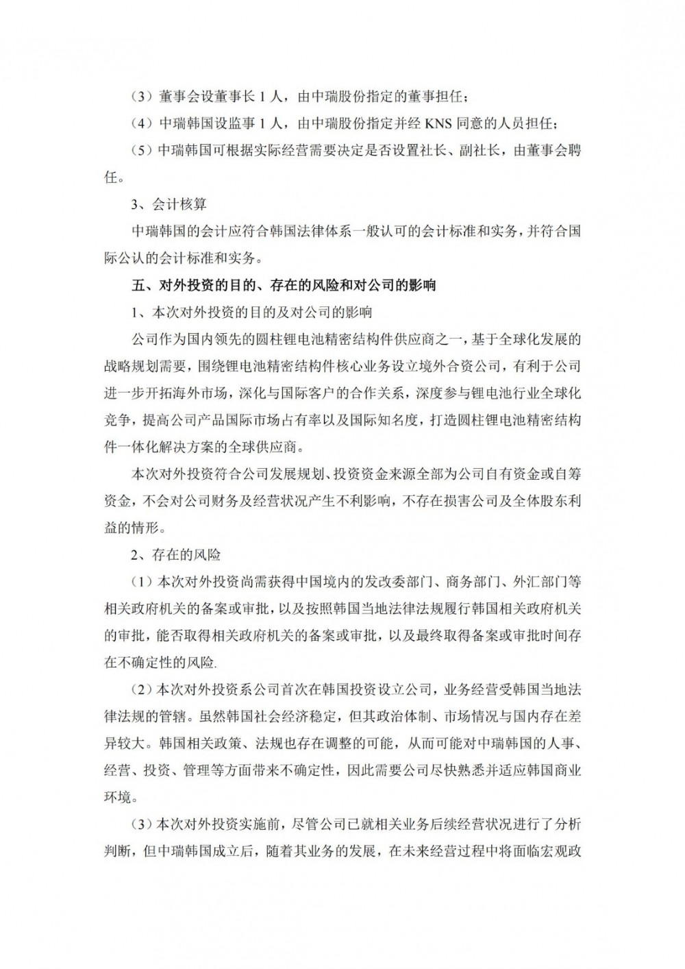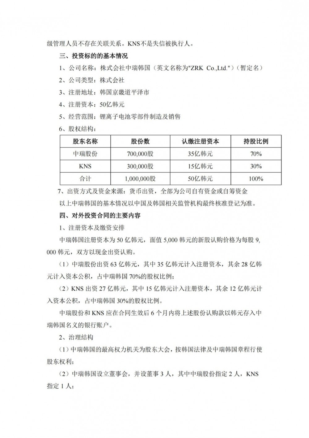 据储能界了解到,6月25日,中瑞股份发布公告称,公司与株式会社KNS(以下简称“KNS”)签署了《合作投资合同》,拟在韩国京畿道平泽市共同设立以锂离子电池零部件制造及销售为主要业务的境外控股子公司株式会社中瑞韩国,中瑞韩国注册资本为50亿韩元,其中公司将持有中瑞韩国70%的股权比例,KNS将持有中瑞韩国30%的股权比例。