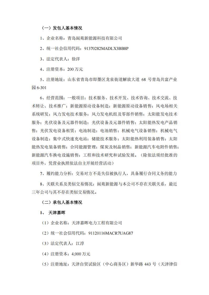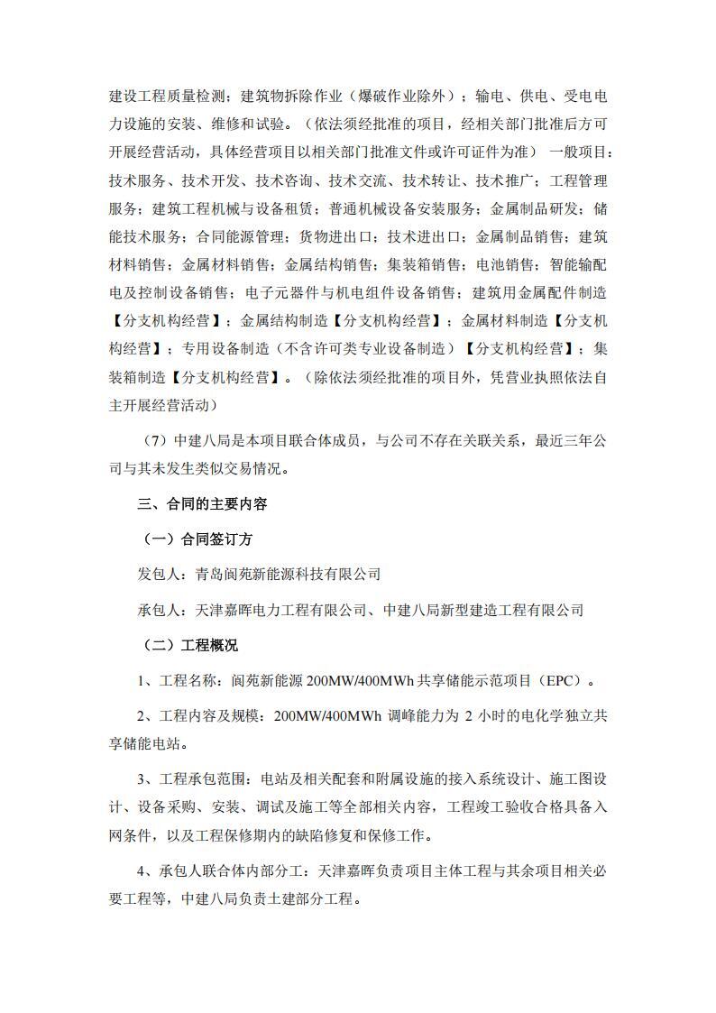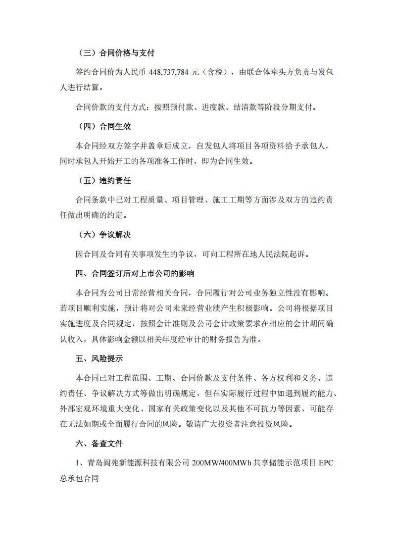 该项目 签约合同价为人民币 4.49 亿元(含税),由联合体牵头方负责与发包人进行结算。工程承包范围包括电站及相关配套和附属设施的接入系统设计、施工图设计、设备采购、安装、调试及施工等全部相关内容,工程竣工验收合格具备入网条件,以及工程保修期内的缺陷修复和保修工作。