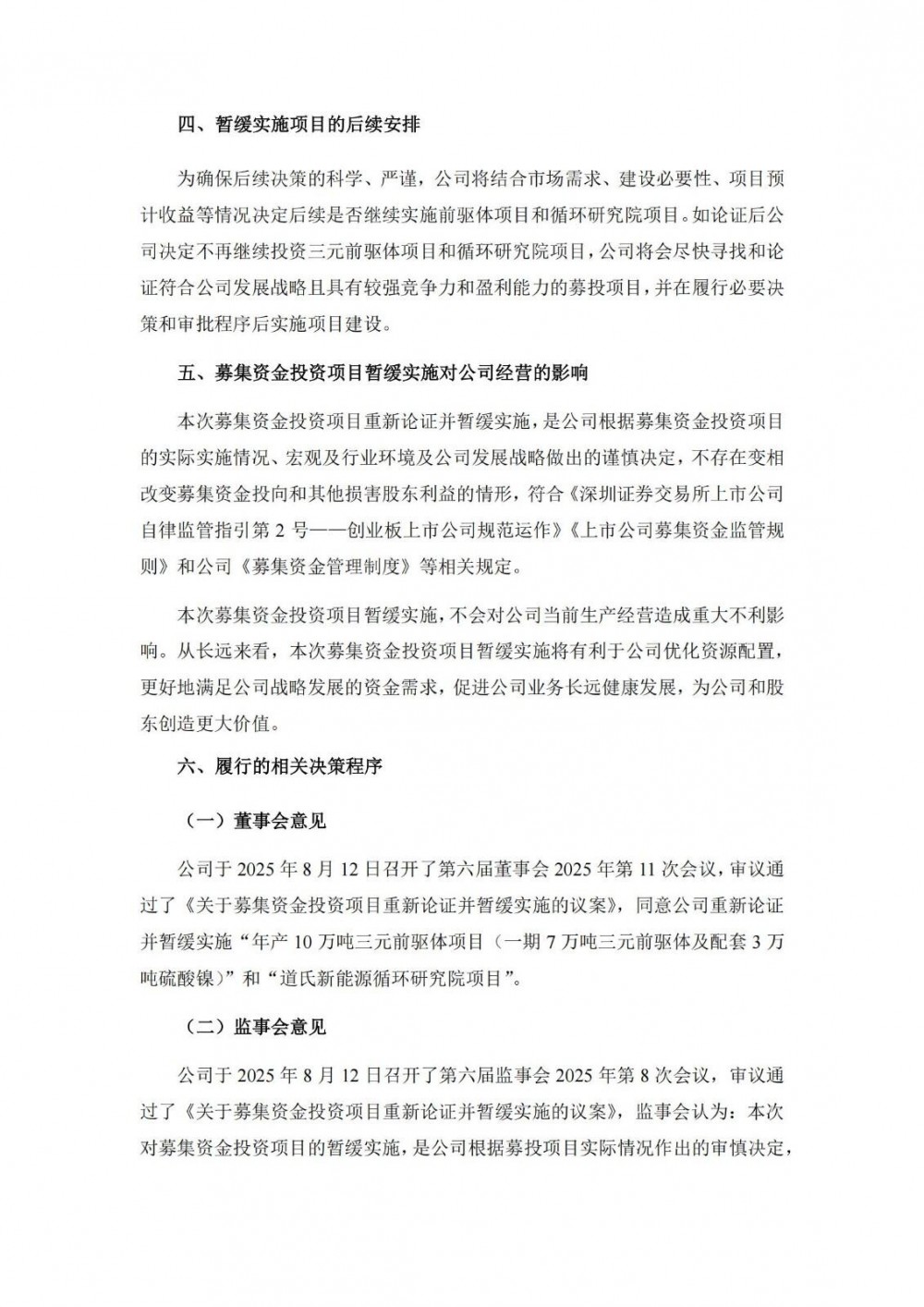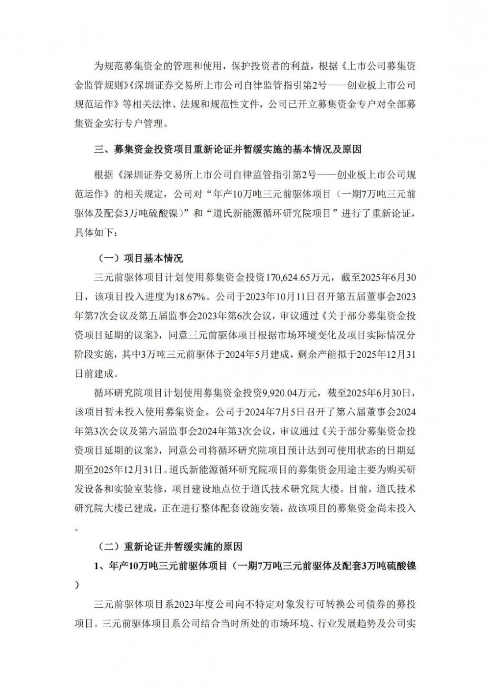 道氏技术表示,在募投项目实施过程中,市场环境发生了较大变化。国内新能源汽车市场增速放缓,海外新能源汽车市场受政治因素影响导致发展不及预期,加之磷酸铁锂材料凭借成本与安全性优势抢占新能源汽车中低端市场,对三元正极材料市场造成一定的挤压,进而传导至上游的三元前驱体产业。尽管具身智能、低空经济等新兴产业的崛起将为锂电池市场带来增量空间,但当前其对高性能三元前驱体的拉动作用离规模化效应仍需一定周期,因此,从现阶段看,三元前驱体的主要市场环境发生了较大变化,行业竞争加剧,项目实施存在不确定性及投资建设风险增强。鉴于公司现有产能足以满足现阶段的订单需求,本着谨慎投资的原则,为更好地保护公司及投资者的利益,经审慎评估,公司认为目前并非继续投资建设该项目剩余产能的最佳时机,决定对本项目进行重新论证并暂缓实施。在暂缓实施期间,除针对已建成部分产能的合同尾款待后续使用募集资金支付外,公司不会使用募集资金投入新增产能。锂离子电池正极材料是公司的重要发展方向,公司将针对客户终端应用场景,持续加强技术储备、新产品研发、市场布局与开拓力度,促进新能源汽车动力电池、固态电池、低空经济等产业高质量发展。