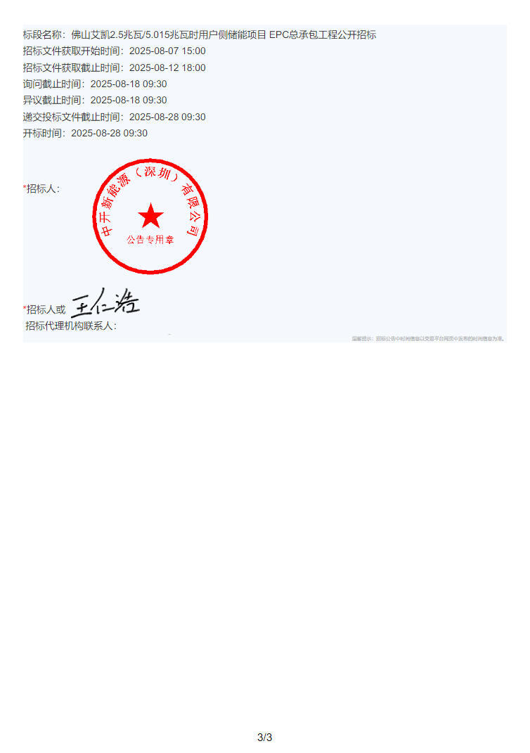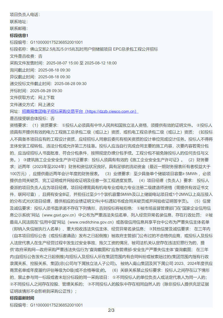 近日,佛山艾凯2.5兆瓦/5.015兆瓦时用户侧储能项目EPC总承包工程招标公告发布。
