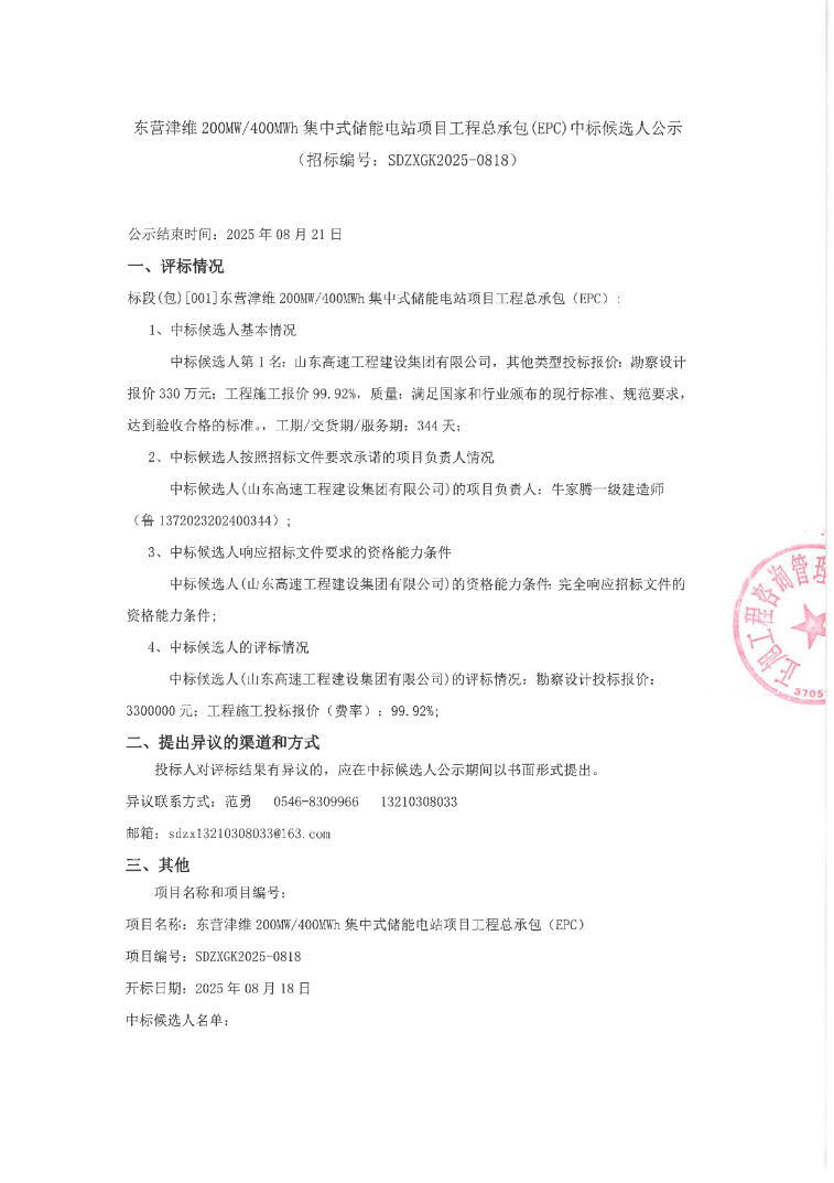 8月18日,东营津维200MW/400MWh集中式储能电站项目工程总承包(EPC)中标候选人公示。